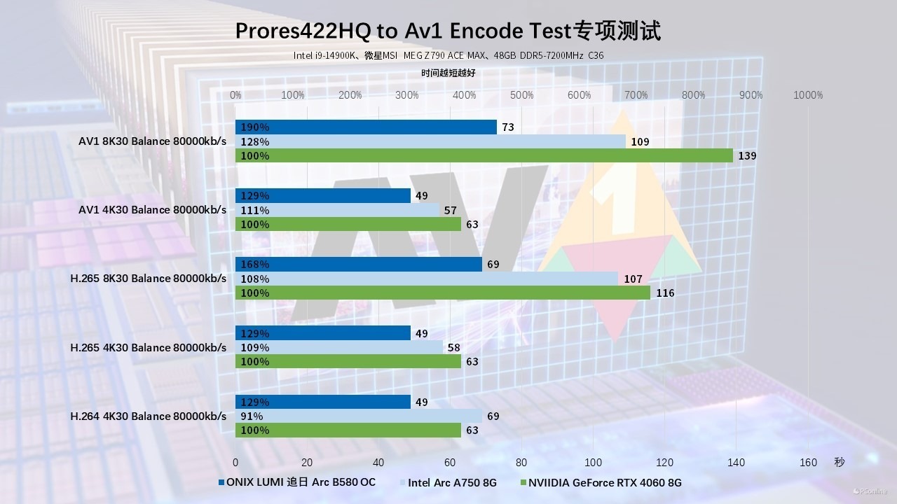 不过在视频编码能力上,两者目前呈现出的差距则比较明显。如图所示,用AV1编码一条8k30帧的超高清视频,ONIX追日B580 OC所用时间几乎为RTX4060的一半。即便是编码目前已经成为主流的H.265视频,ONIX追日B580 OC编码的时间依然明显短于RTX4060。