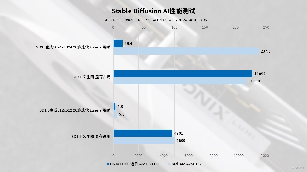 如果这个结果还不够明显的话,不妨看看Stable Diffusion XL的生图差距,在20步迭代、1024x1024分辨率、采用Euler a采样算法的设置下,ONIX追日B580 OC生成一张图的时间仅为15.4秒,而A750受累于8GB显存,跑了237.5秒,也就是将近4分钟的时间才能生成一张图,这个差异就是好用与不能用的区别了。