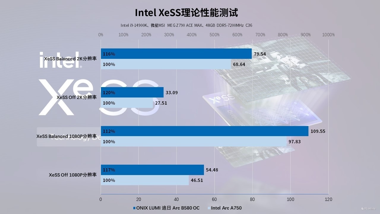 最后看看《赛博朋克2077》的效果,作为新生代的“光追跑分压力测试基准”,这个游戏不但支持时下前沿的帧率增益技术,而且优化还都不错,跑分结果也印证了这一点。在2k分辨率+光追预设高的画质设定下,两张I卡的原生画质的表现都是30FPS以内,一旦开启XeSS,游戏的流畅度就会得到明显改善,ONIX追日B580 OC 12GB在XeSS_平衡档也有不错的流畅度,而A750则需要调到XeSS_超级性能档,但至少也能流畅运行。