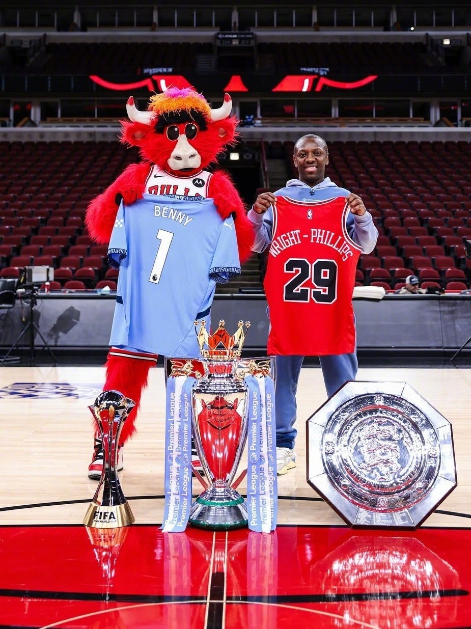据NBA球队芝加哥公牛官方消息,曼城名宿赖特-菲利普斯携带奖杯造访了芝加哥公牛主场。