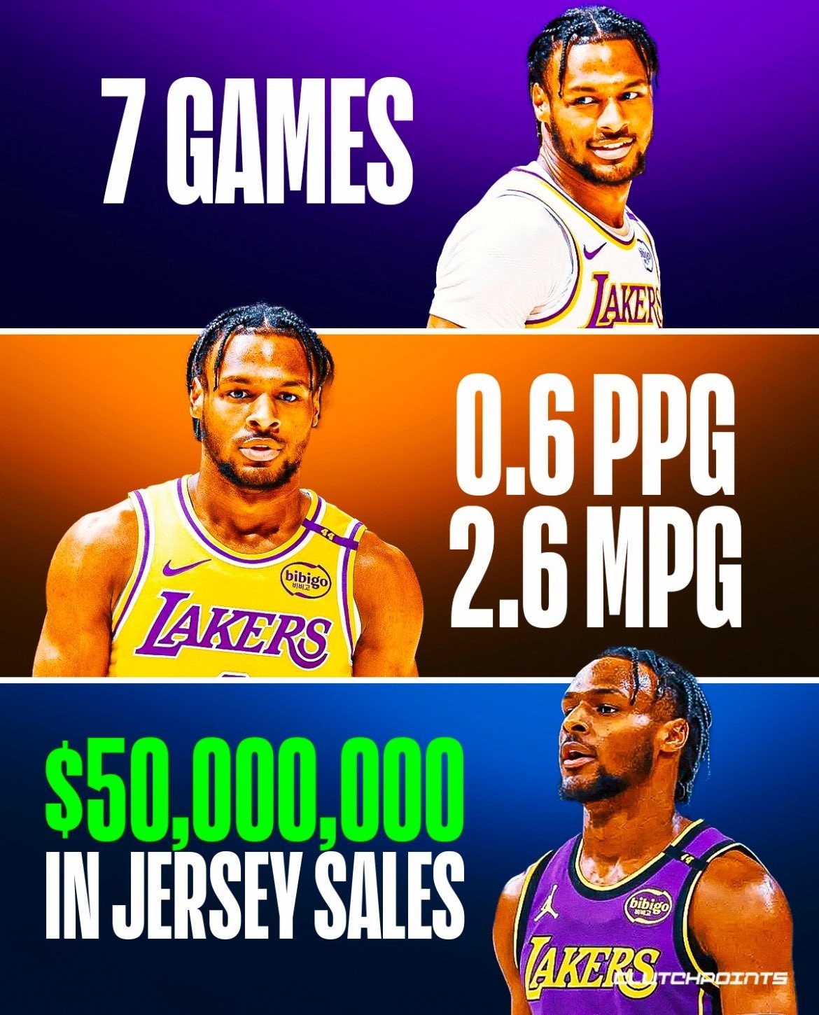 报道称,布朗尼以每件约100美元的价格售出了超过50万件球衣,为湖人队创造了超过5000万美元的收入——这创下了NBA纪录,甚至超过了他父亲勒布朗-詹姆斯新秀赛季的球衣销量。对于一个在实战比赛中几乎没有球场影响力的球员来说,这个销售成绩令人叹为观止。