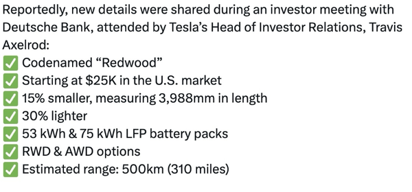 据Tesla Newswire消息,特斯拉Model Q车长为3988mm,提供53kWh和75kWh两种磷酸铁锂电池,动力系统提供后驱及四驱两种版本,预计CLTC纯电续航里程最低可达310英里(约500公里)。美国市场上,特斯拉Model Q的起售价格预计为2.5万美元左右,约合人民币181900元左右。