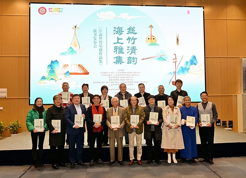 会上,还举行了《江南丝竹乐新作品集》新书发布仪式。这本书中收录了五位作曲家顾冠仁、周成龙、王爱康、崔新、傅沛华近年来作曲并尚未发表的《品茗·观鱼》《白云赞》《烟水晴岚》《灯会》《明月染春水》等8首江南丝竹新曲曲谱,现场赠予长三角江南丝竹乐团。