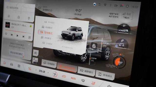 同时,深蓝G318中间还有一把“能量锁”,其由电脑来控制前后轴扭矩,左右扭矩在0-100之间进行无级分配,相比传统分动箱,响应速度同样更快。因此,深蓝G318不仅拥有后驱车的稳定性,还具备四驱车该有的动力性。此次,我们找到一个角度为 15°左右的坡道进行爬坡,最终也能够顺利通过。