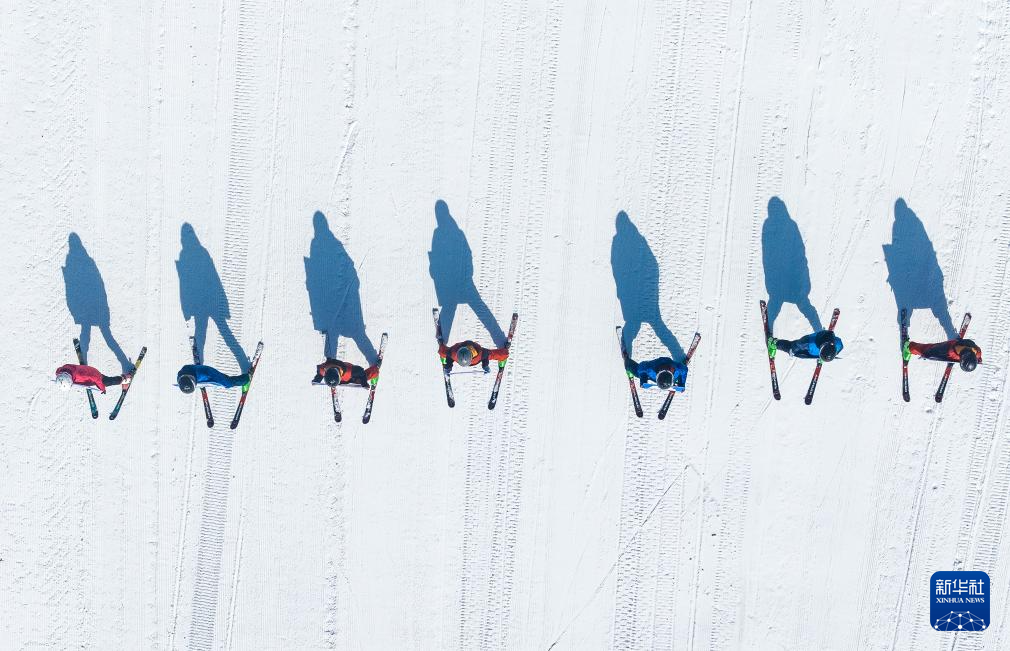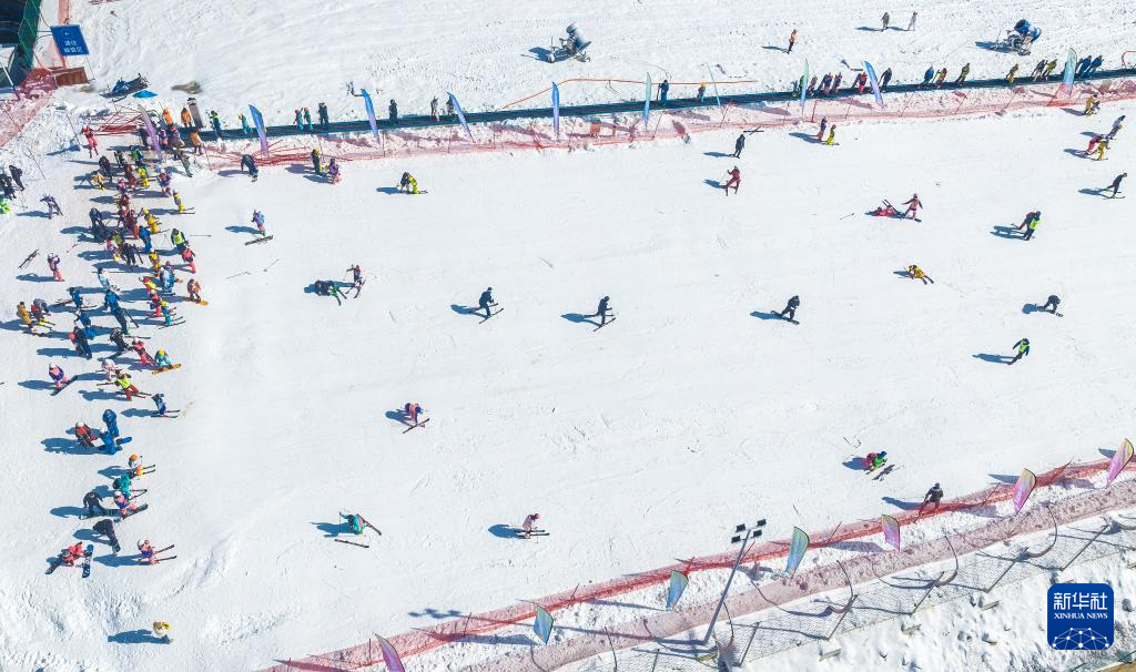 12月15日,游客在湖北省宜昌市秭归县屈原故里国际滑雪场滑雪(无人机照片)。