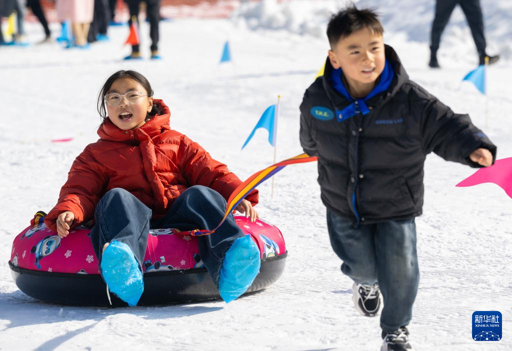 12月15日,小朋友在湖北省宜昌市秭归县屈原故里国际滑雪场玩耍。