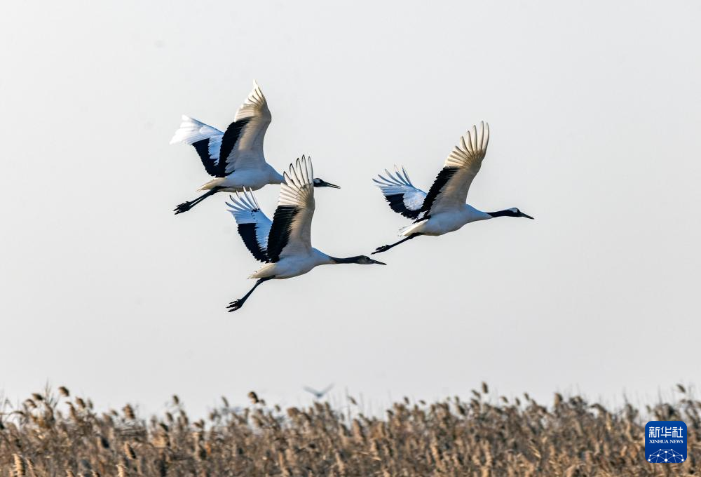 12月15日,丹顶鹤在江苏盐城湿地珍禽国家级自然保护区内飞翔。
