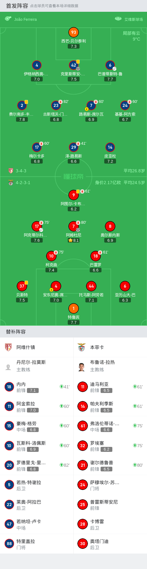 在葡萄牙足球超级联赛第14轮的较量中,阿维什镇坐镇主场迎战本菲卡。比赛中,本菲卡的阿姆杜尼在队友阿克蒂尔科奥卢的助攻下,成功攻入一球,为球队取得领先。随后,阿维什镇的克里斯蒂安-卡斯特罗在巴普蒂斯特-鲁的精妙传球下,扳平比分。最终,双方以1-1握手言和,未能分出胜负。