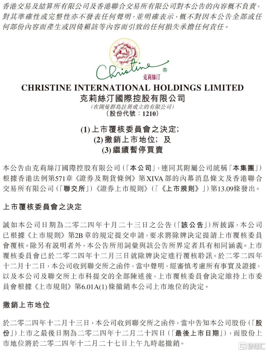 近日克莉丝汀发布公告称,公司在12月12日收到香港联交所函件,经审慎考虑所有事实及证据,以及本公司及联交所上市科提交的全部陈述后,上市覆核委员会决定维持上市委员会撤销本公司上市地位的决定。克莉丝汀将在12月27日被撤销上市地位。克莉丝汀巅峰时期曾拥有超1000家门店,但是在两年前,其门店已经全部歇业。
