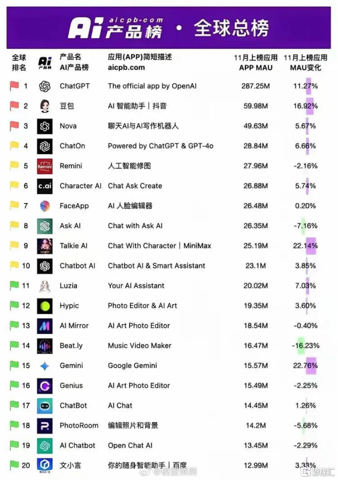 在11月的AI产品全球月活跃排行榜上,豆包APP的MAU达到了5998万,仅次于OpenAI的ChatGPT,位列全球第二。
