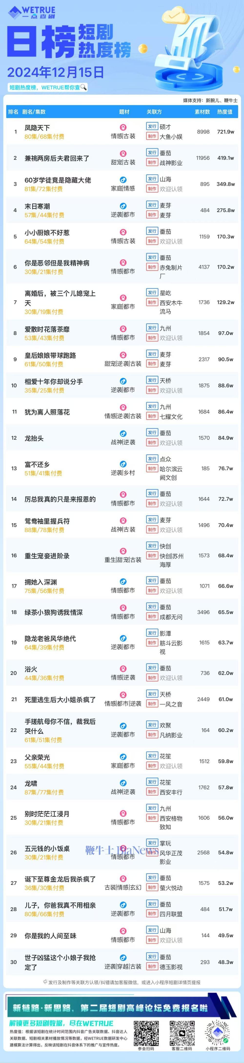 编者按:为帮助短剧从业者提供更多信息,专注于短剧报道的新腕儿和科技媒体鞭牛士联合WETRUE短剧热度榜共同推出短剧热度榜。