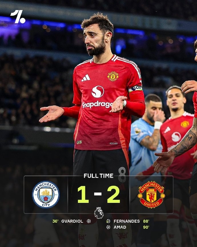 上半场格瓦迪奥尔打破僵局,曼城1-0领先曼联。下半场,B费点射扳平比分。第90分钟,阿玛德上演绝杀。最终曼城主场1-2遭曼联逆转。
