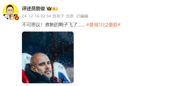 知名体育评论员詹俊发文:不可思议!煮熟的鸭子飞了……