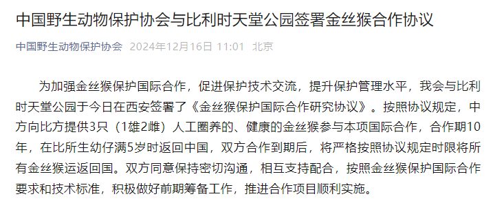 12月16日,据中国野生动物保护协会:为加强金丝猴保护国际合作,促进保护技术交流,提升保护管理水平,我会与比利时天堂公园于今日在西安签署了《金丝猴保护国际合作研究协议》。