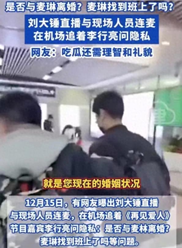 该网友在机场追着李行亮询问“是否与麦琳离婚”“麦琳找到班上了吗”等问题,李行亮全程没有回应,在工作人员保护下离开。