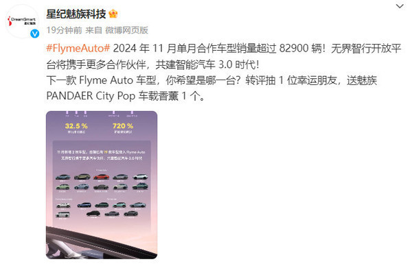 Flyme Auto合作车型11月销量超82900辆