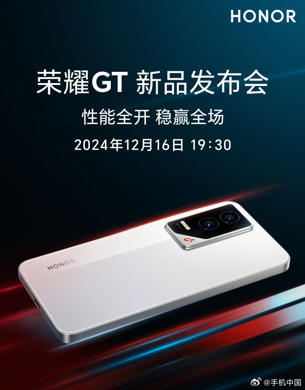 #冠军联调荣耀GT今晚见# 定位高性能游戏手机的荣耀GT将于19:30发布。