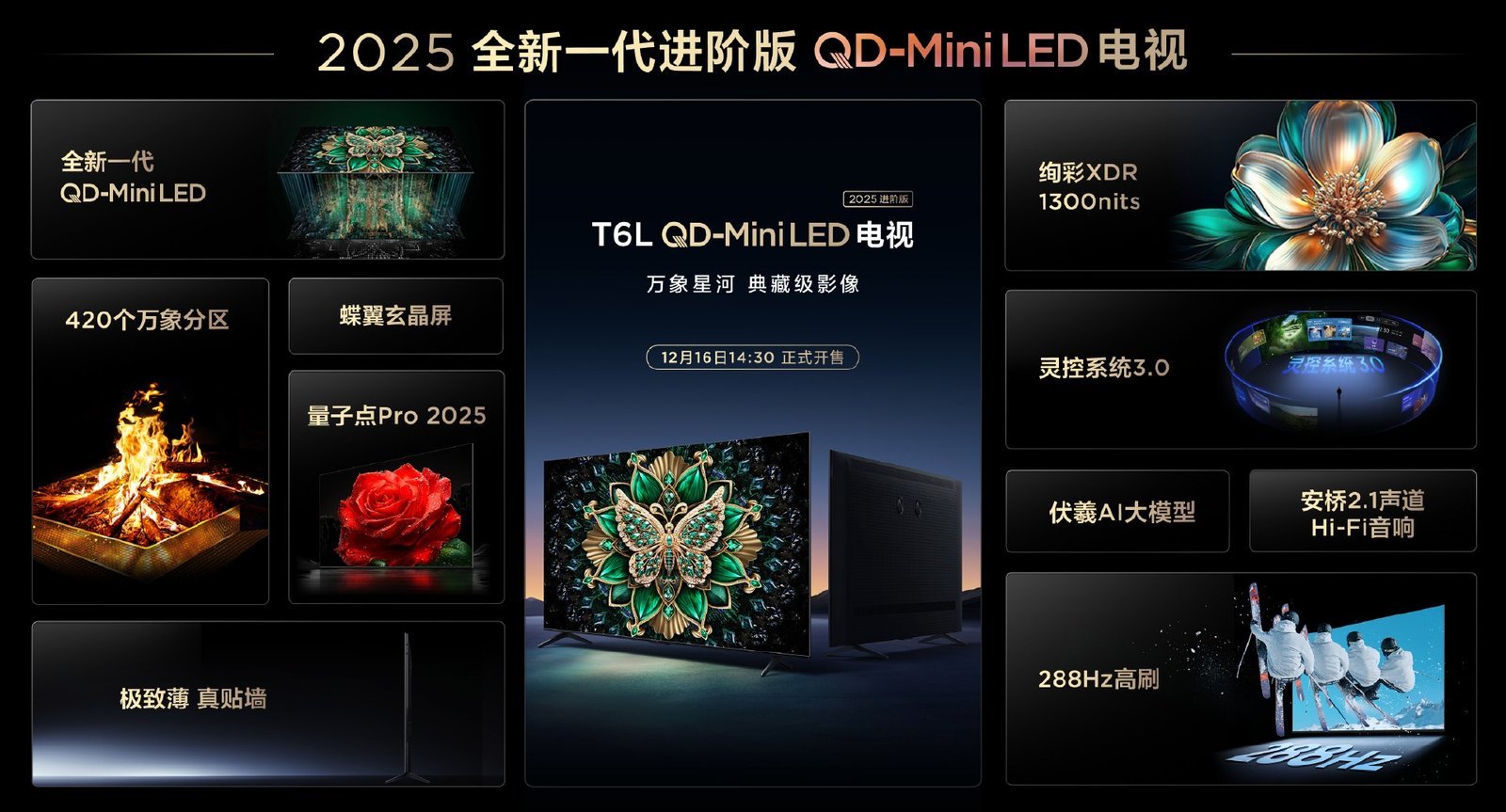12 月 16 日下午,2024 TCL QD-Mini LED 新技术发布会正式召开。在这场技术发布会上,TCL 回顾和公布了不少过去取得的成果,带来了一整套从背光到成像的全链路光学解决方案以及灵控桌面 3.0 等惊喜。在在技术发布会末尾,他们还带来了一款全新的 TCL T6L QD-Mini LED 电视新品。