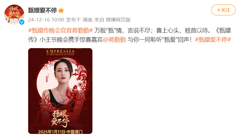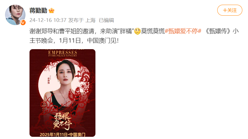 12月16日,演员蒋勤勤发文官宣自己将参与《甄嬛传晚会》。