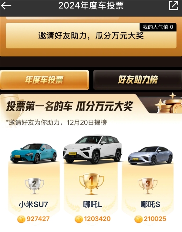 目前,哪吒L以超过120万的得票数高居榜首,小米SU7紧随其后,得票数达到92万,而哪吒S则排名第三,获得21万票。