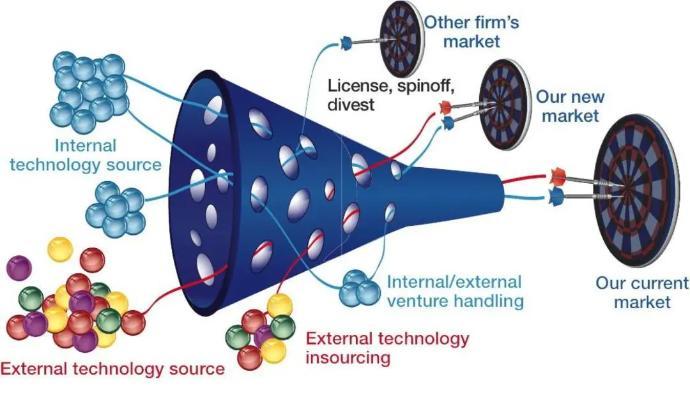 Henry Chesbrough在著作《通过技术创新盈利势在必行》中,曾提出过一个创新的“漏斗模型”。开放式创新一开始鼓励百花齐放,但最终只有10%的技术能够通过这个漏斗,成功抵达目标市场target market,进入到商业化与产业化的下一个阶段,而其余的90%的技术,逐渐淡出人们的视野。
