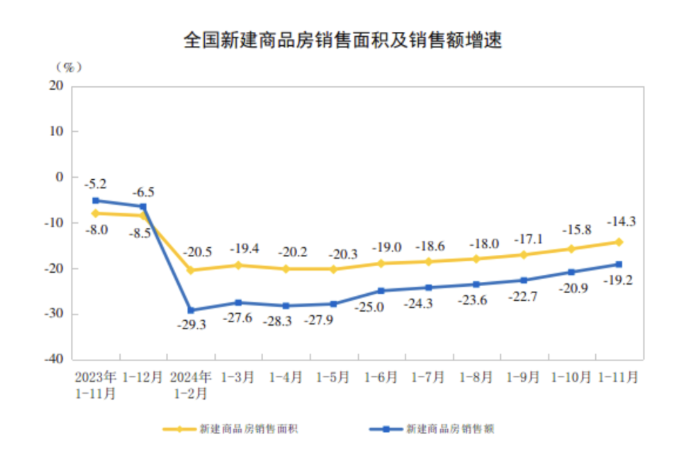 根据国家统计局监测数据,10月份以来房地产市场交易总体回升,11月份新建商品房销售情况进一步改善。1-11月份,全国新建商品房销售面积和销售金额同比降幅分别比1-10月份收窄1.5和1.7个百分点。其中,11月份当月销售面积和销售额都实现正增长。