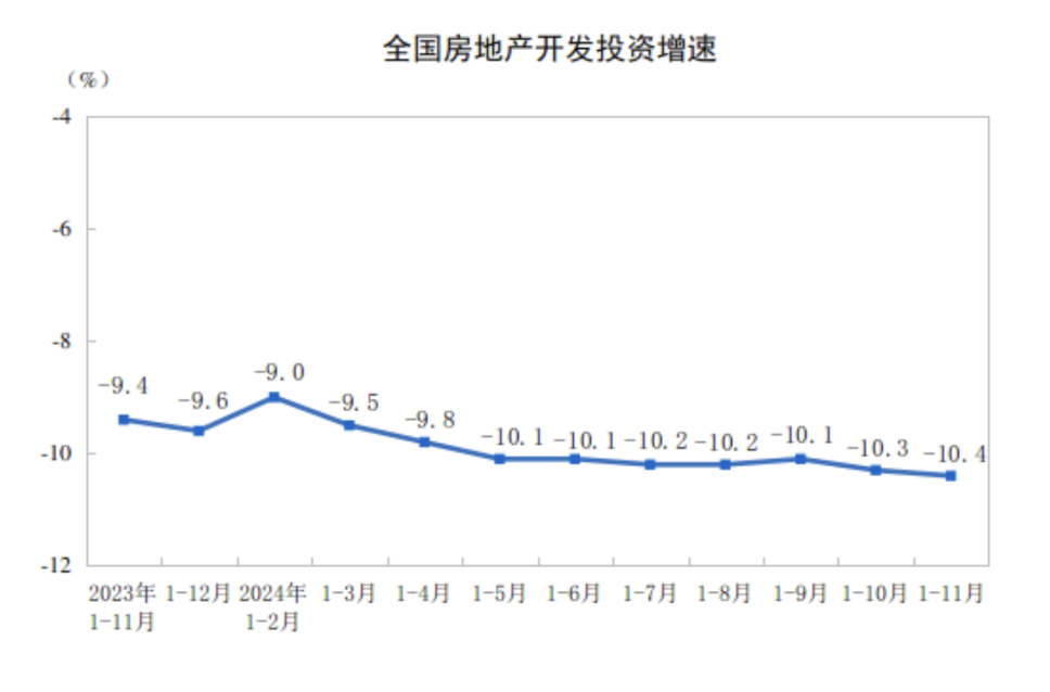 国家统计局数据显示,1-11月份,全国房地产开发投资93634亿元,同比下降10.4%(按可比口径计算);其中,住宅投资71190亿元,下降10.5%。