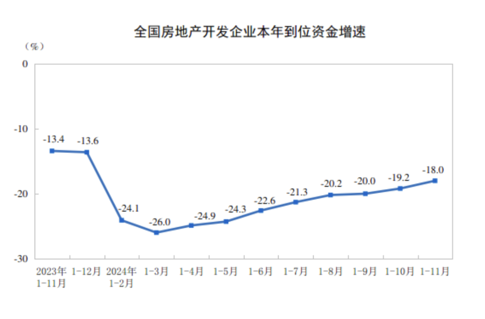 12月16日,国家统计局发布2024年1-11月份全国房地产市场基本情况。从销售端数据而言,1-11月新建商品房销售额、销售面积累计同比降幅延续收窄态势,其中销售面积累计同比降幅已连续6个月收窄,销售额降幅连续7个月收窄,居民置业信心持续修复。