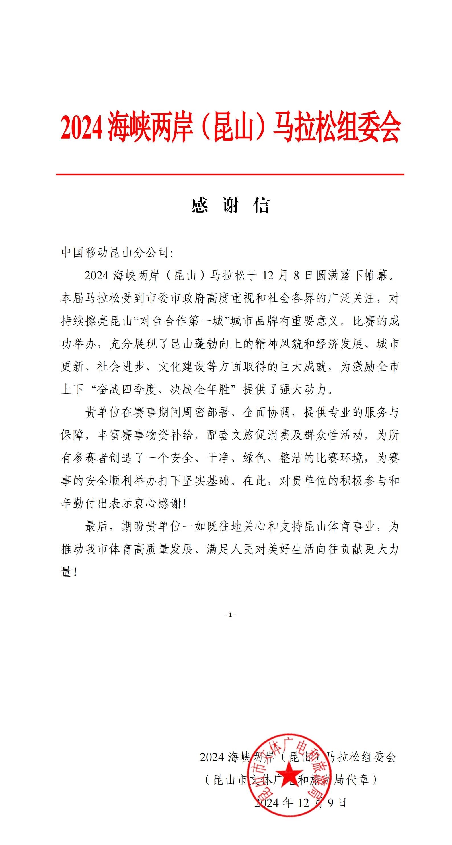 近日,2024海峡两岸(昆山)马拉松时隔4年再次开跑,当地政府高度重视,苏州移动昆山分公司积极配合,全程提供专业网络保障,并在赛后获得2024海峡两岸(昆山)马拉松组委会的感谢信。