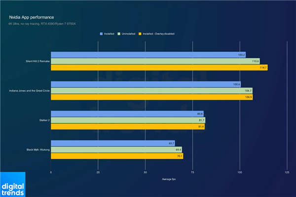 游戏帧率实测,蓝色为安装NVIDIA App、绿色为卸载、黄色为关闭Overlay功能