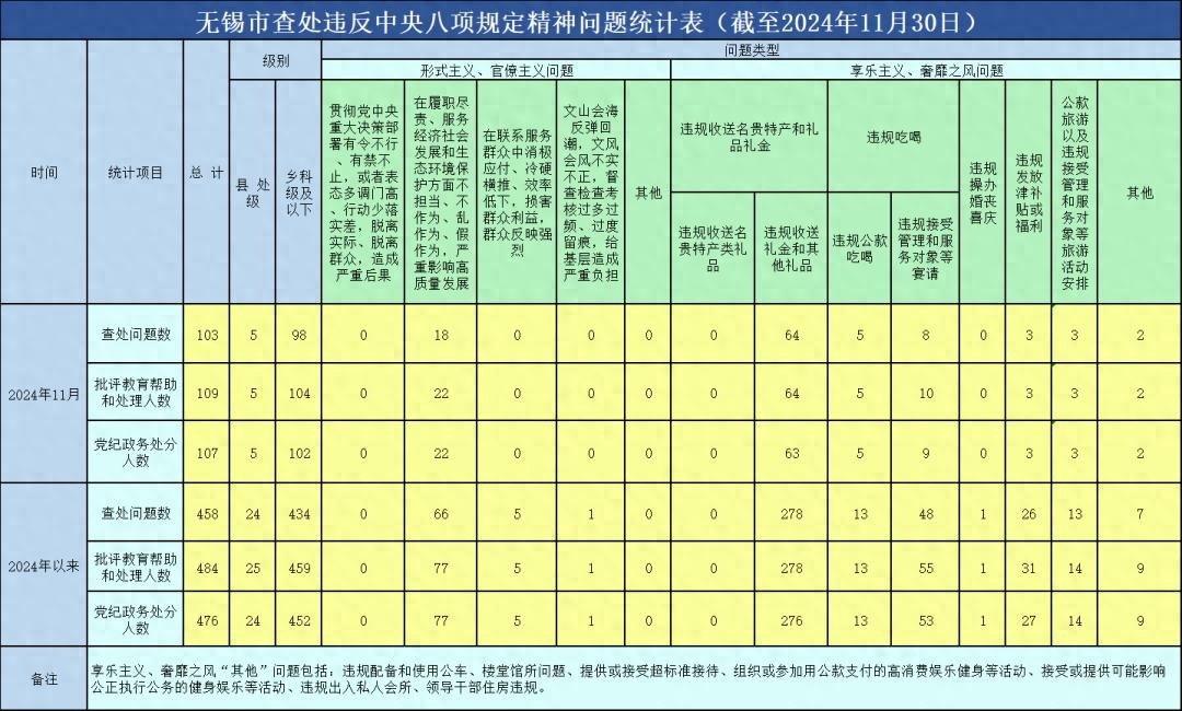 2024年以来,截至11月30日,全市查处违反中央八项规定精神问题情况如下: