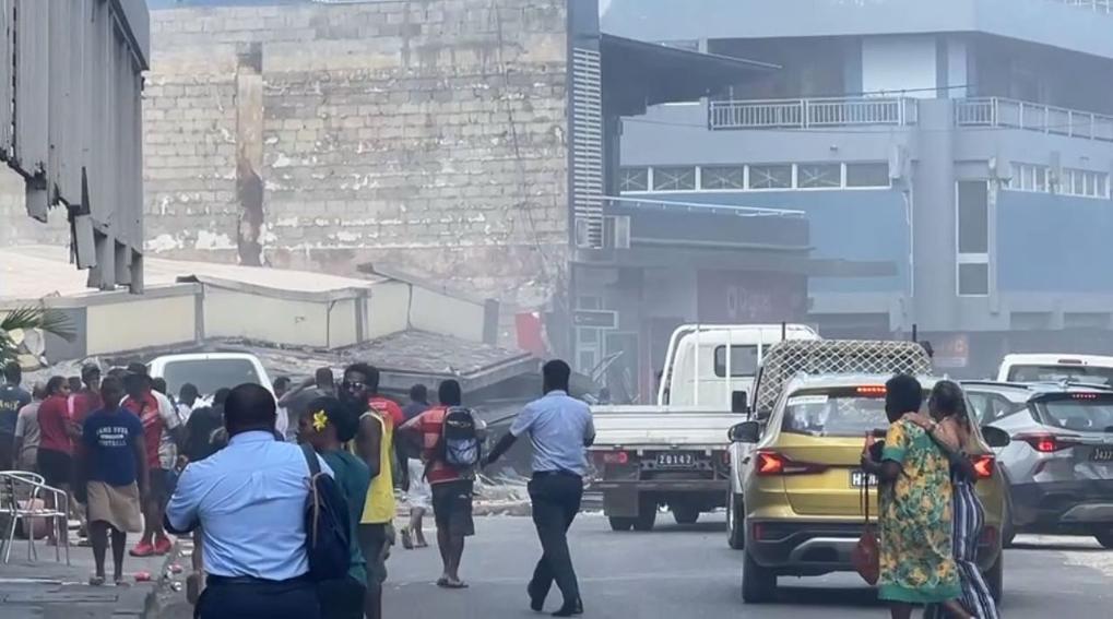 这是12月17日在瓦努阿图首都维拉港拍摄的一座倒塌的建筑(视频截图)。新华社发