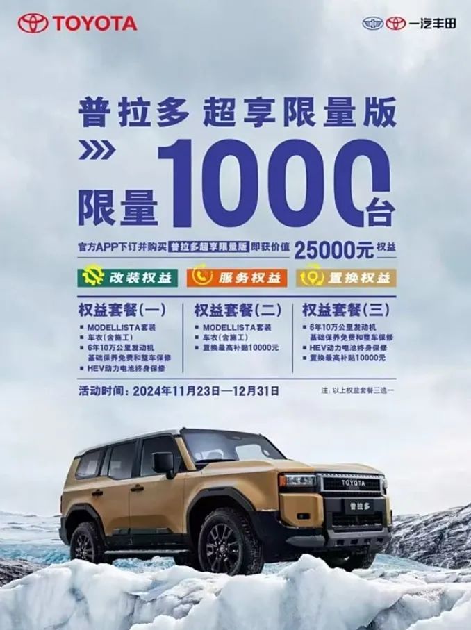 这么看来,大家就能理解一汽丰田为啥还选择订这么个不讨喜的价格了吧,因为有底气,知道普拉多就是个能赚的盆满钵满的车。但那还是2020年以前,那时候自主品牌像样的硬派SUV太少了,放到2024年,很多人对于普拉多价格的预期就是30多万。因为不好卖,普拉多的价格也不坚挺了,但不是指的官方说的两万五。