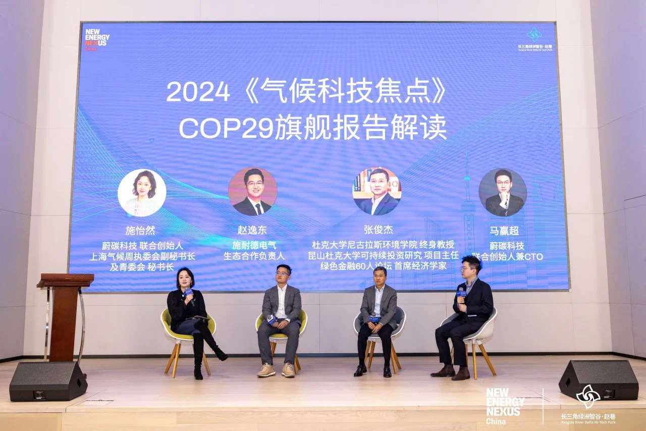 作为在第29届联合国气候变化大会(COP29)上正式发布的《气候科技焦点:创新赋能绿色供应链》报告的知识合作伙伴,蔚碳科技联合创始人兼CTO马嬴超现场为大家解读了报告关键亮点与内容,并与杜克大学尼古拉斯环境学院终身教授、昆山杜克大学可持续投资研究项目主任、绿色金融60人论坛首席经济学家张俊杰、 施耐德电气生态合作负责人赵逸东以及蔚碳科技联合创始人兼执行董事、上海气候周执委会秘书处副秘书长及青委会秘书长施怡然一同针对该报告展开圆桌对话,不但进一步解读了专题报告内容,而且洞察了新技术如何引领气候科技变革,展现了科技赋能可持续发展的创新实践。