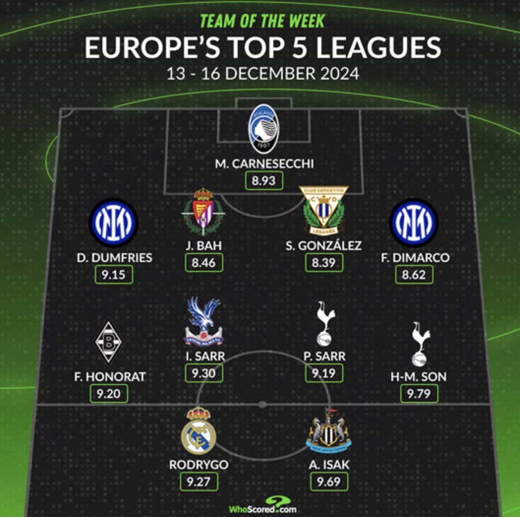 目前,本周(当地时间12月13日-16日)的五大联赛已经完赛。WhoScored列出了本周五大联赛最佳阵容。