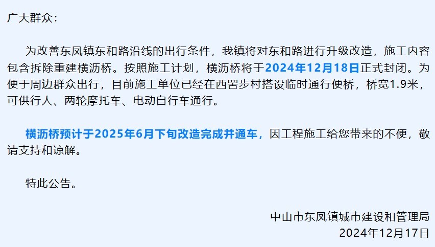 中山市东凤镇城市建设和管理局发布通知称,横沥桥于今日(12月18日)开始封闭改造,预计明年6月下旬改造完成并通车。