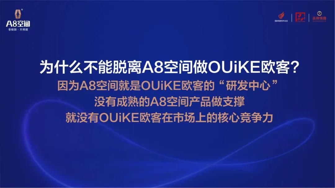 为什么不能脱离 A8 空间做OUiKE欧客? 因为A8空间就是OUiKE欧客的“研发中心”,如果没有运营商、设计师、客户、供应链以及公司研发团队五个维度共同对A8空间的合力研发,没有A8空间投入的大量研发成本,没有成熟的A8空间的产品作支撑,就没有OUiKE欧客在市场上的核心竞争力。