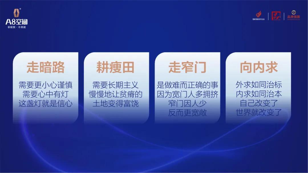 有人说,A8 空间发展的势头正猛,这几年行业这么难的情况下,A8 空间年复合增长还能保持近40%的增长率,你又是个有雄心壮志的人,为什么放着这么好的势头,不一鼓作气,乘胜快速发展。所以,我的指导思想是稳中求进。