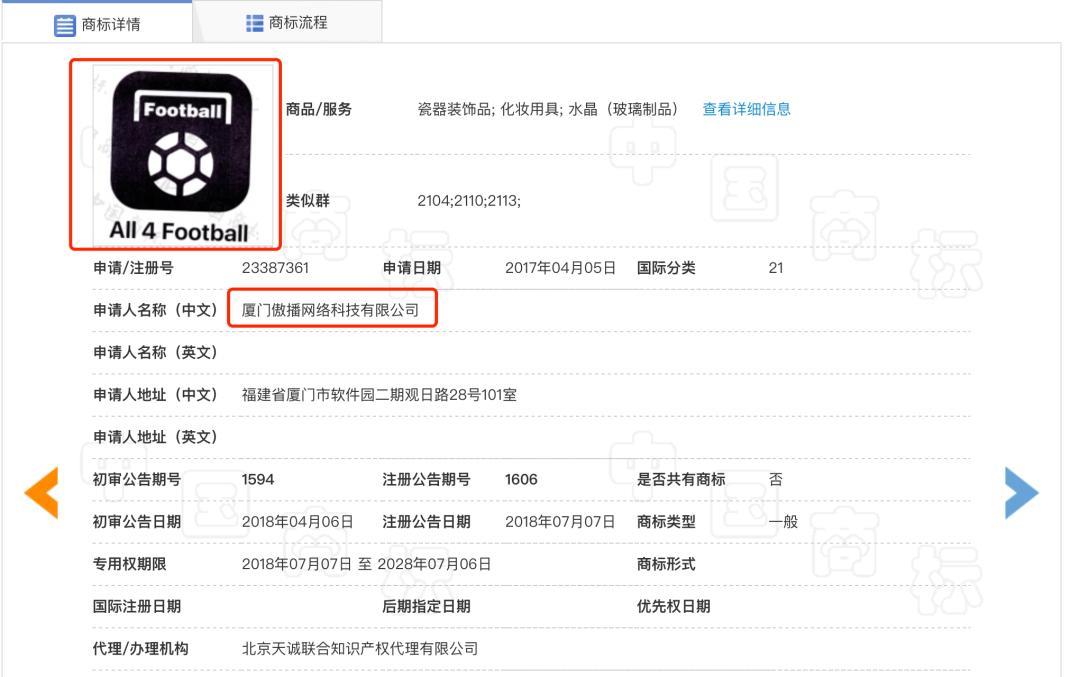 直播吧:本次拍卖完第三天,4月29号,直播吧/傲播由财务提交资料注册厦门懂球帝公司,厦门工商显示4月30号成立公司。从逻辑上来讲,拍卖前每个拍卖者都无法确保能拍到商标,不可能提前注册厦门懂球帝。