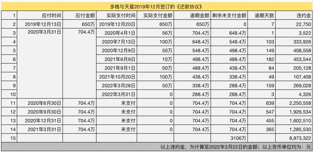 2019年12月,天星资本、多格科技及陈聪签署《还款协议》,约定多格科技向天星资本返还投资款与收益回报共计4172万元,并约定相应的还款时间与违约责任——2019年12月13日支付第一笔650万,2020年3月31日支付第二笔704.4万,此后每三个月支付704.4万,直至2021年3月31日付完最后一笔704.4万。