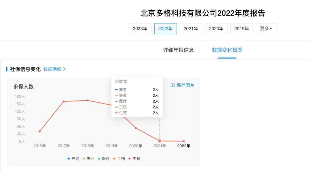 2023年4月19日,工商信息平台披露多格科技2022年报,其中参保人数为1人。在多格科技2021年报中,该数字为2人。