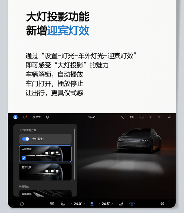 座舱方面,此次升级带来了全新的萌宠壁纸和屏保,大灯投影功能新增迎宾灯效,可通过“设置-灯光-车外灯光-迎宾灯效”开启。