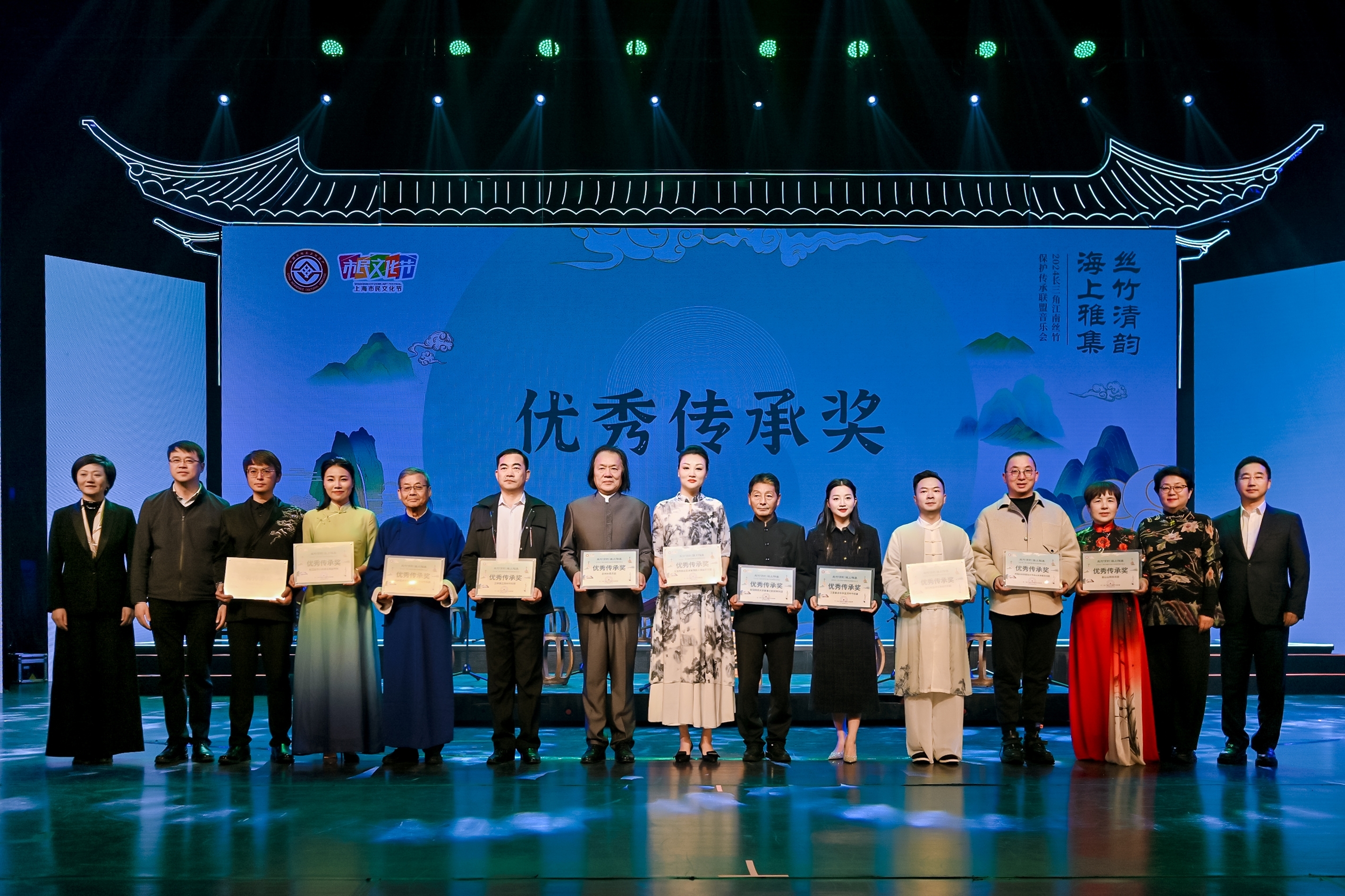长三角专场演出开始前,上海市文化和旅游局党组成员、副局长、一级巡视员程梅红,上海市文化和旅游局非遗处处长陈平,浦东新区区委宣传部副部长、文体旅游局局长邵世志,浦东新区区委宣传部副部长、文体旅游局副局长彭薇芬为各参演团队颁发「长三角江南丝竹保护传承联盟」优秀传承奖,表彰各省市团队在江南丝竹保护上的贡献。