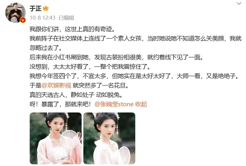 今年10月,于正晒照官宣新签约素人美女张婉莹,大赞对方外貌“真的天选古人,静如处子动如脱兔”。