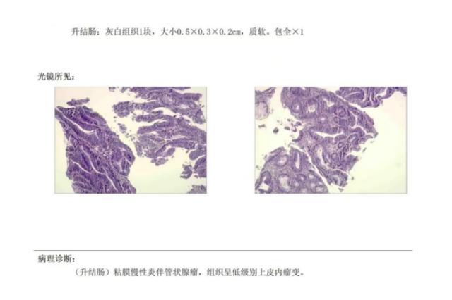 术后第二天、第二周电话随访,都诉无特殊不适。追踪病检结果提示:(升结肠)管状腺瘤,低级别上皮内瘤变。