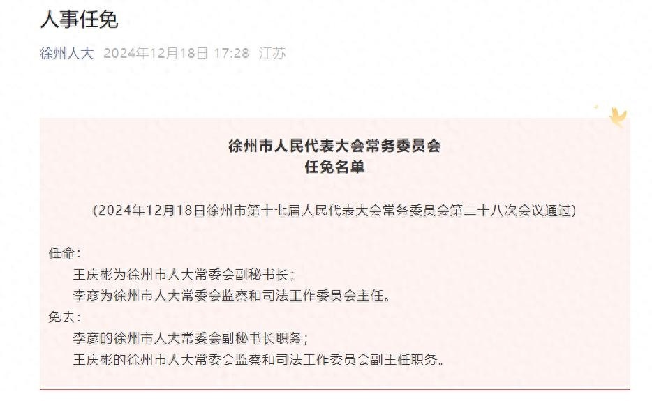 王庆彬的徐州市人大常委会监察和司法工作委员会副主任职务。