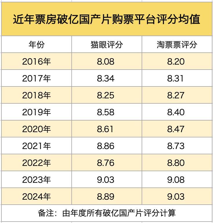 我们也总结整理了这几年的两大平台评分的均值,现如今的评分均值对比七年前已经涨了接近1整分。事实上,这个数据的整理依然是不够全面的,因为和豆瓣评分一样,影片开分和下映后的评分差距巨大,如果只是统计开分的话,现如今对比七八年前会有更明显的变化。