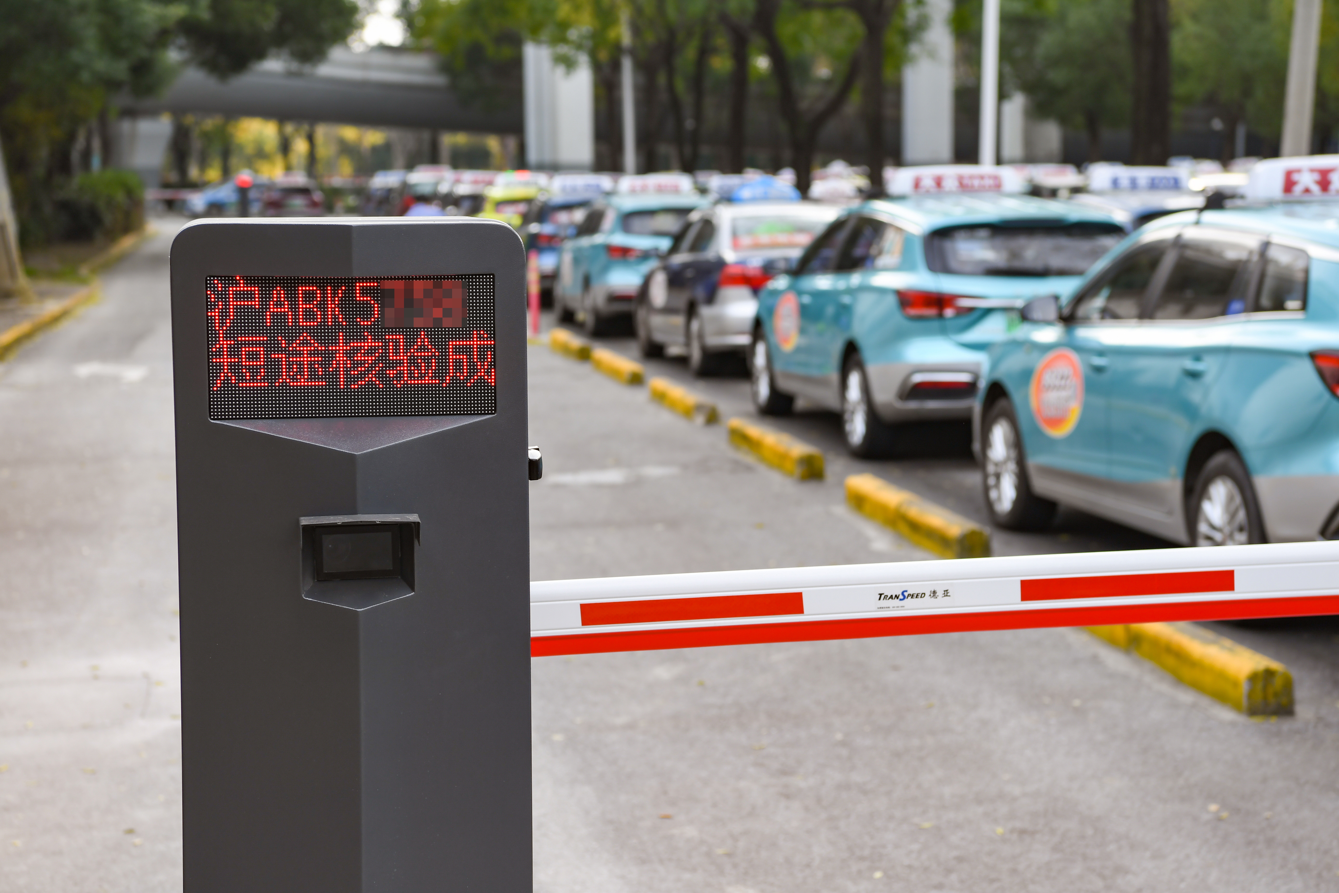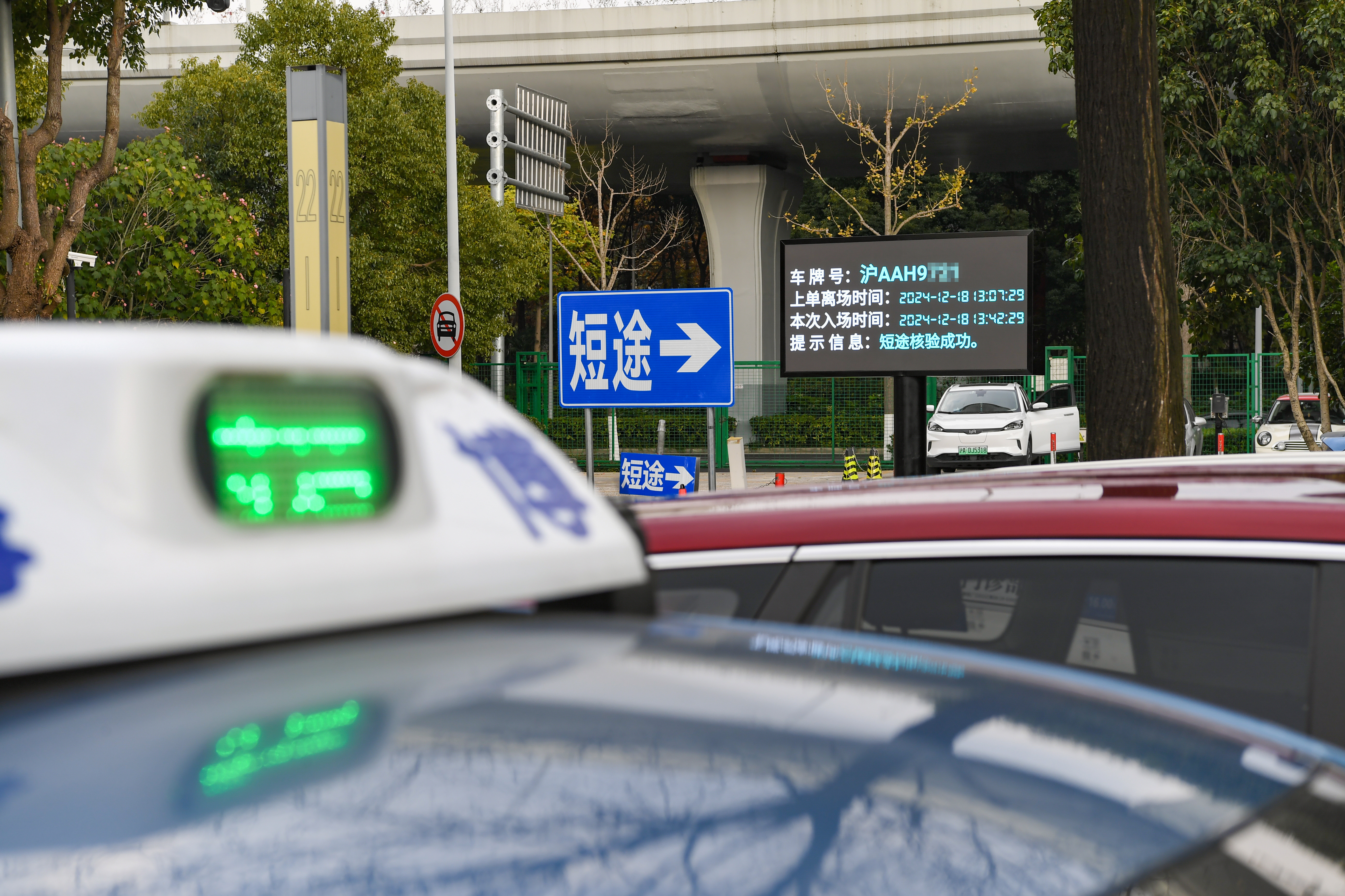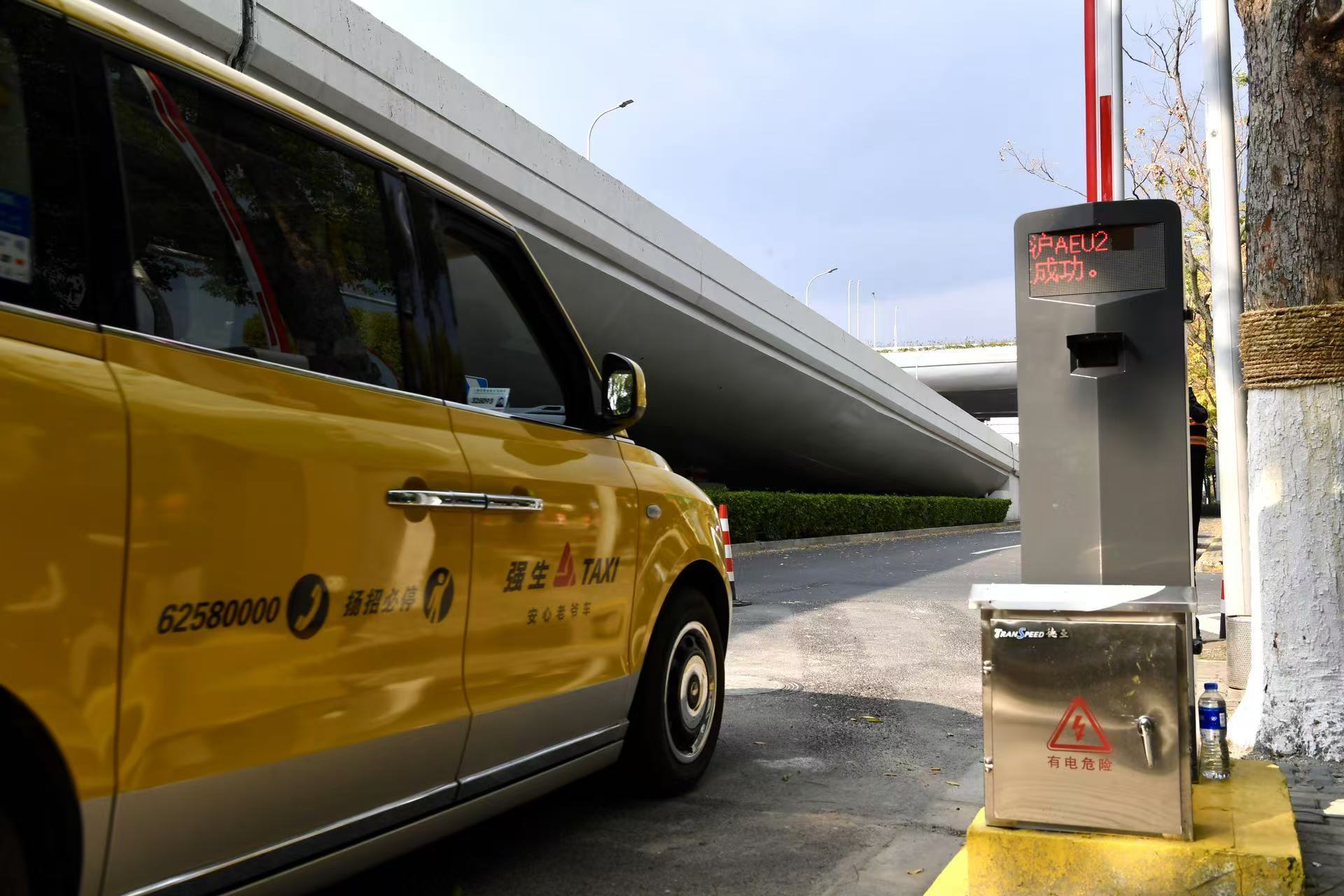 通道长约数百米,入口处位于温虹路和申虹路,出口处设有闸机。这个闸机与普通停车场的闸机没什么不同,区别在于主要通过扫描车牌,比对出租车计价器上传在出行平台和市大数据中心的后台数据,符合短途相关要求,立刻显示“短途核验成功”,自动抬杆,节省排队时间。