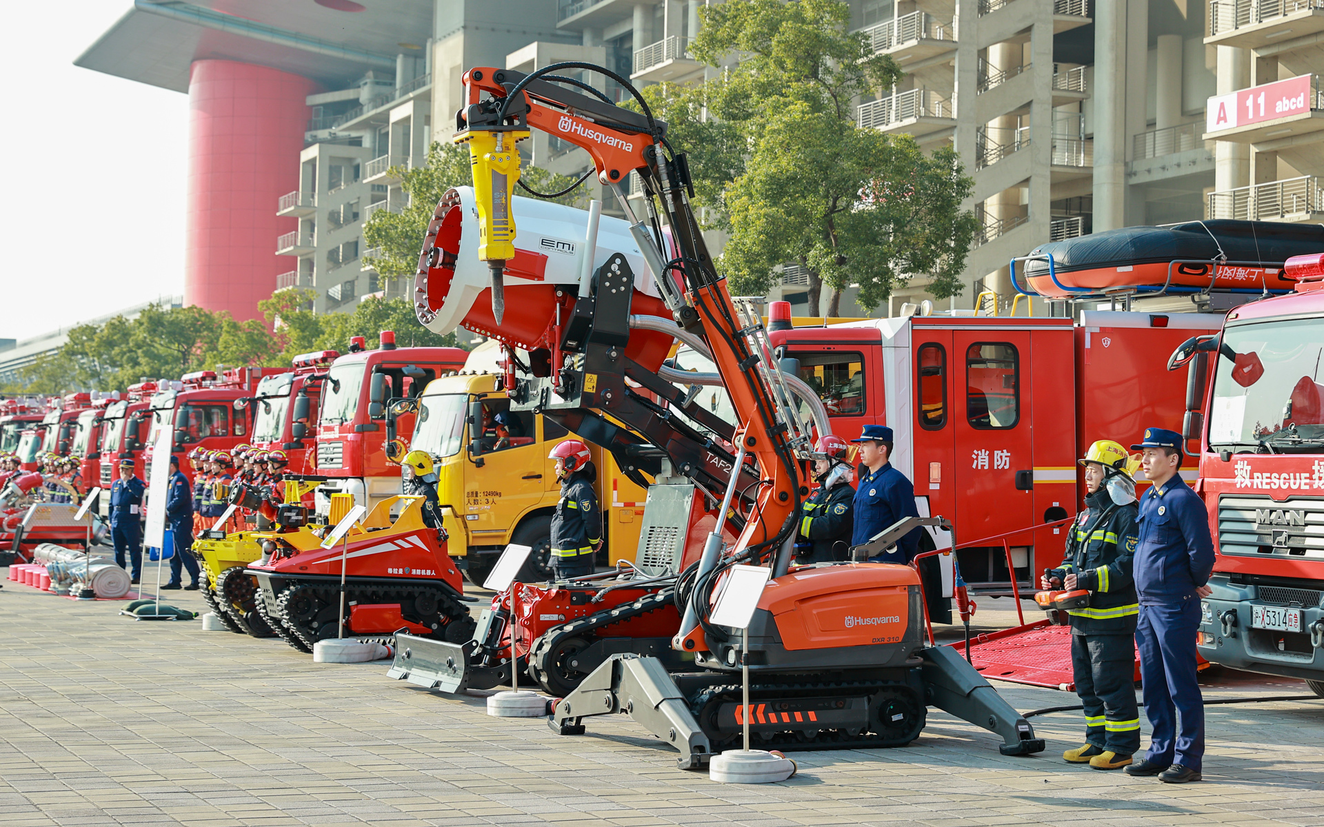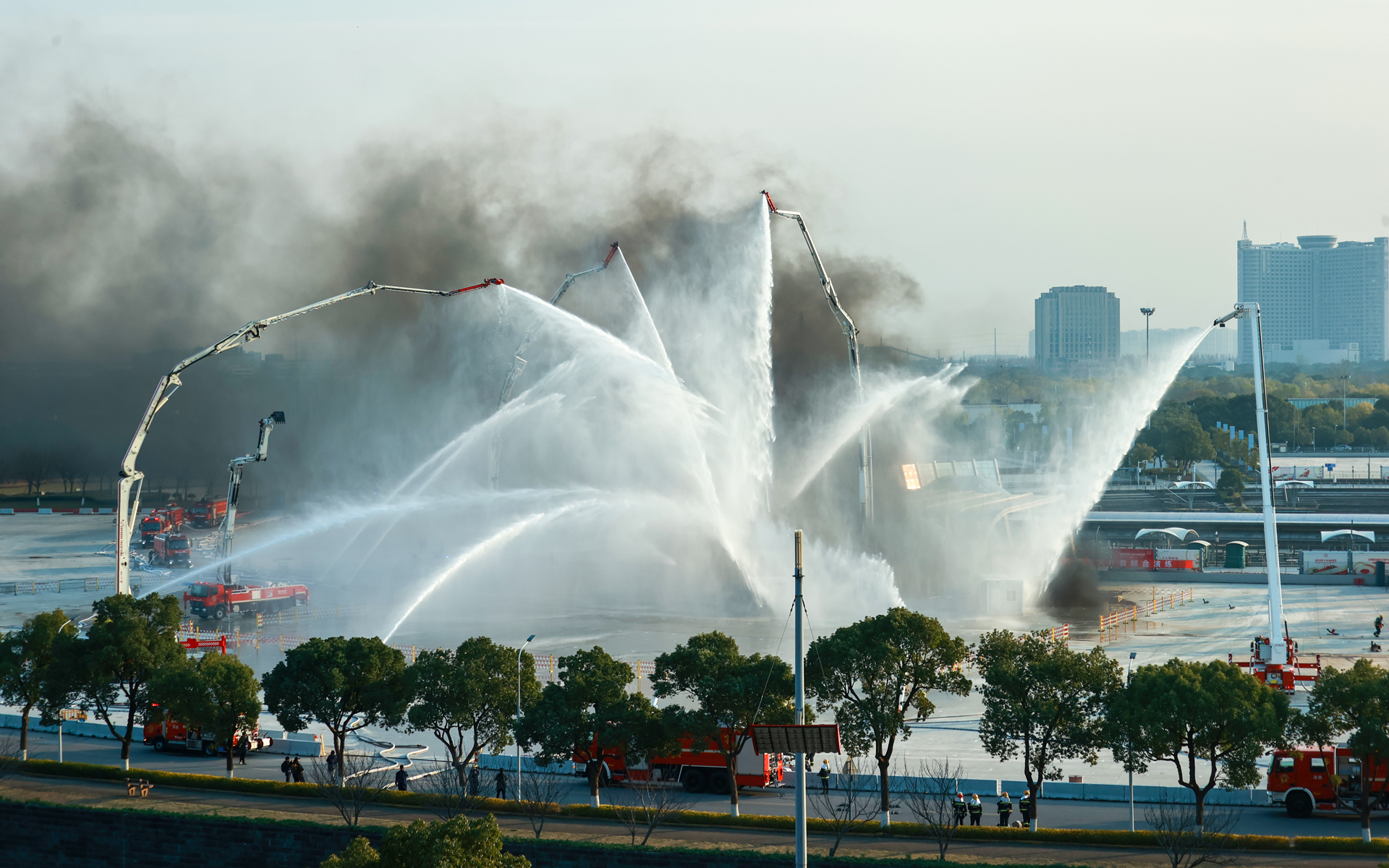 演练假设郊区一处5000平方米大跨度厂房发生火灾,经过现场灾情研判后明确调度力量,精准打击,快速扑灭火灾。演练现场调度多台灭火机器人应对高温高热、易燃易爆等高危环境,能有效降低消防员风险,通过与无人机、大跨距消防车等协作实现战术部署,充分体现科学、高效的现代化消防工作理念。