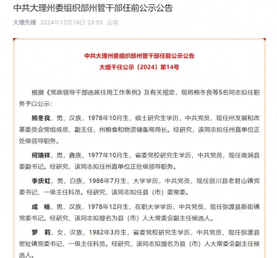公示时间从2024年12月19日起至2024年12月25日止(国家法定节假日除外),如对被公示人员有意见,可通过来信、来电、来访等方式,向中共大理州委组织部干部监督办公室(举报中心)反映。反映问题要实事求是,客观公正,提倡签署真实姓名并告知联系方式。我们将严格遵守工作纪律,履行保密义务。
